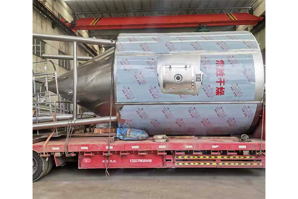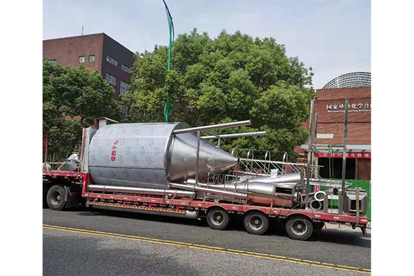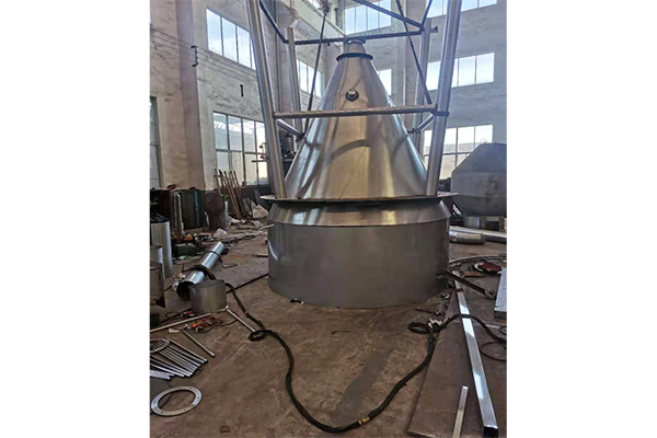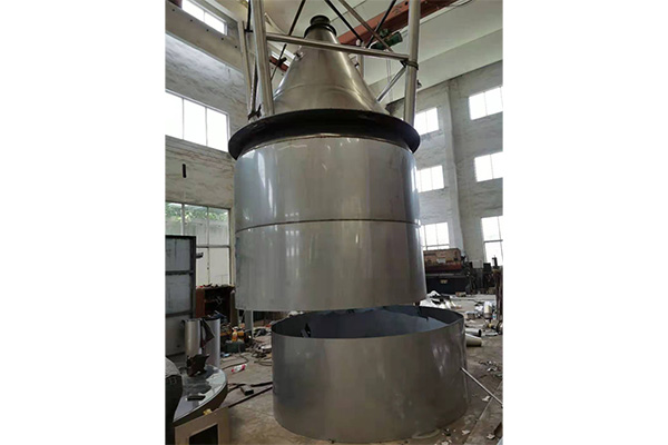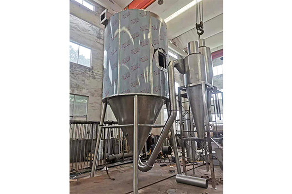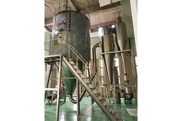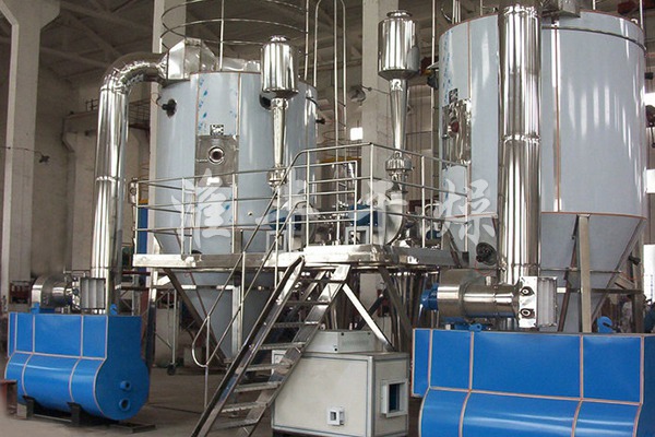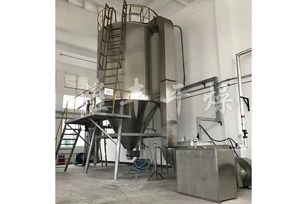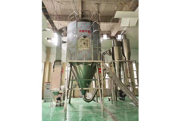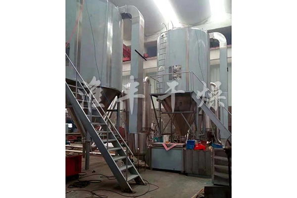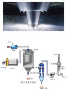 空氣經(jīng)過過濾和加熱,進入干燥器頂部空氣分配器,熱空氣呈螺旋狀均勻地進入干燥室。料液經(jīng)塔體頂部的高速離心霧化器,(旋轉)噴霧成極細微的霧狀液珠,與熱空氣并流接觸,在極短的時間內(nèi)可干燥為成品。成品連續(xù)地由干燥塔底部和旋風分離器中輸出,廢氣由風機排空。